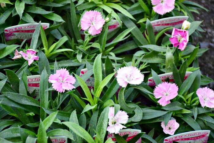 花色が変化する変わり咲きのナデシコです。白から淡いピンク、濃いピンクへと花の色が変わる四季咲き品種。
