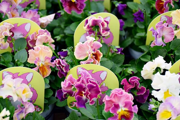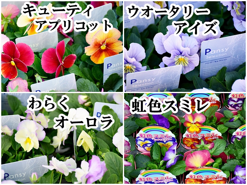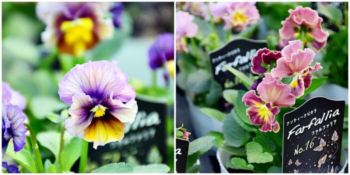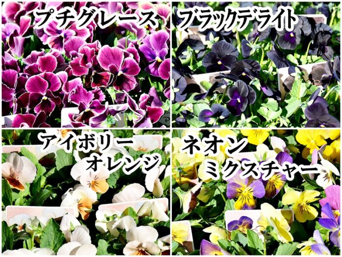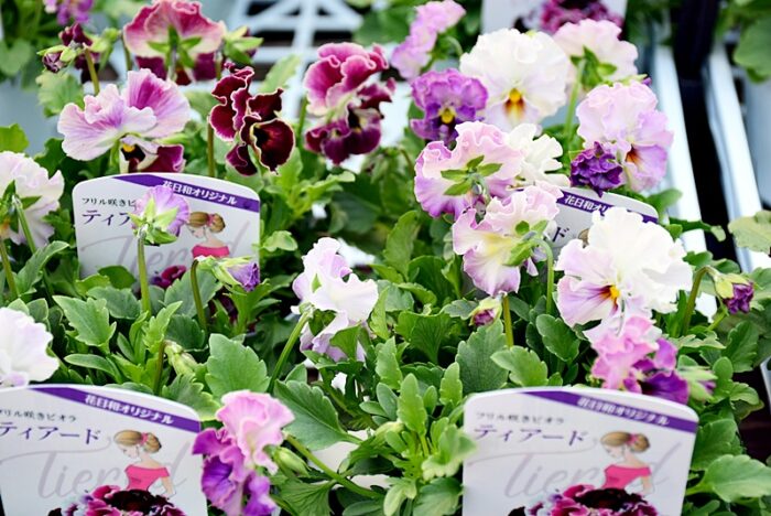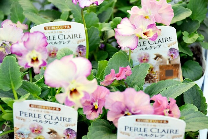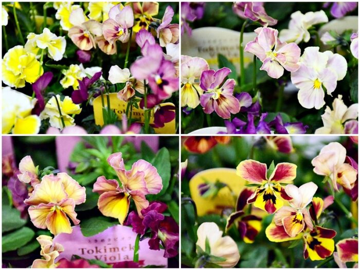 先週入荷の奥田園芸さんのビオラたち、この月曜日には完売に近い状態でしたが今週もたくさん送っていただきました。ビオラのももかシリーズやビビ、ソルベなどの単色も多く入荷しましたが、今週はやっと「ときめきビオラ」がたくさん入荷しました。