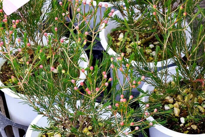 オーストラリア原産の小低木で、緑色の柔らかな針葉と、赤や桃、白花をつけます。