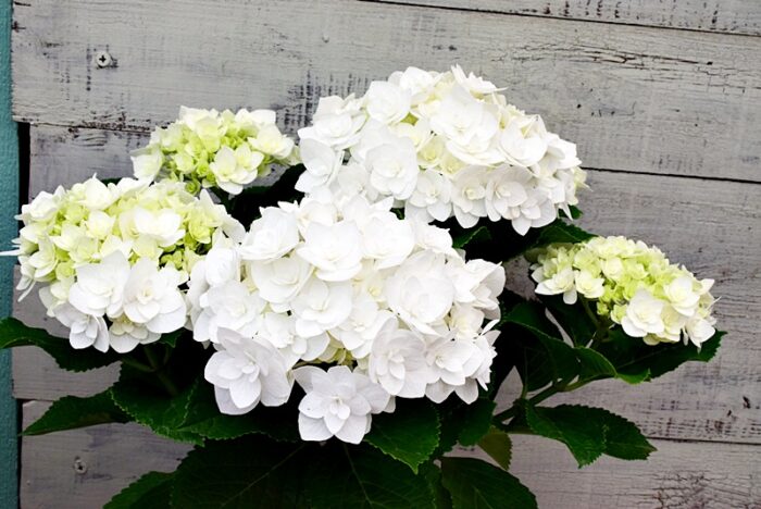 花弁が折り重なるように咲く純白の八重テマリ咲きアジサイ。美しい緑色の秋色に変化します。