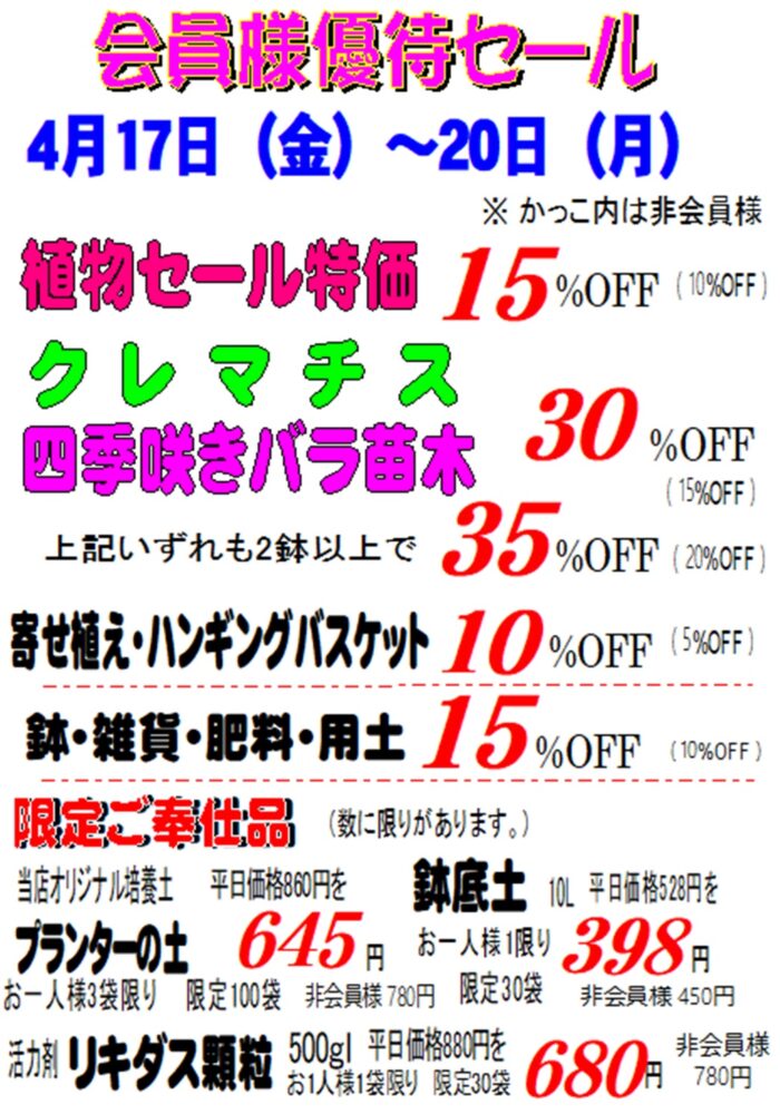 入荷情報の前に明日からの会員様優待セールのご案内です。
