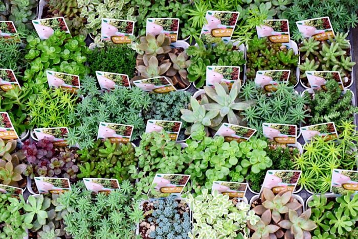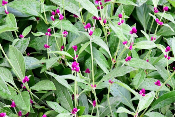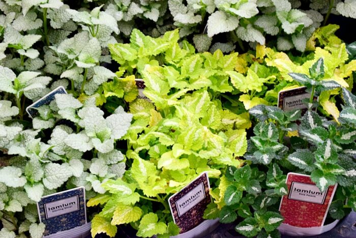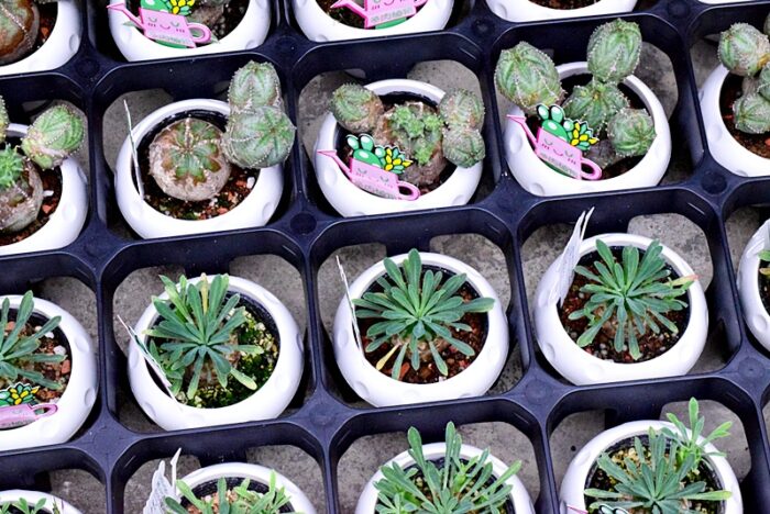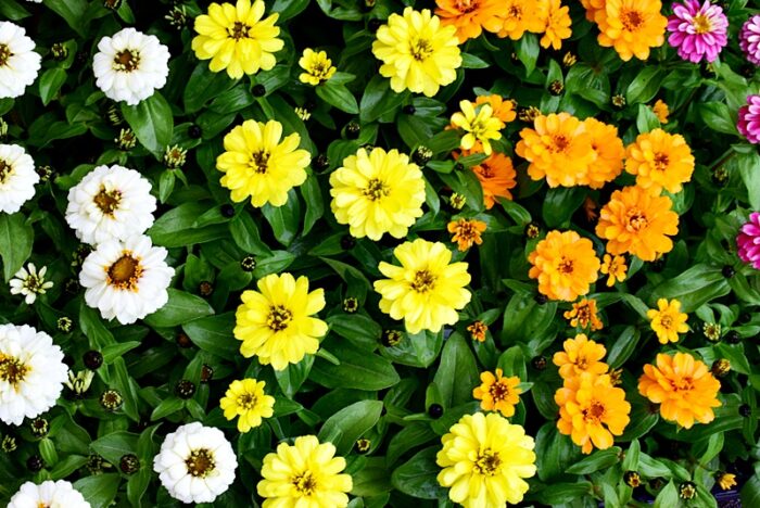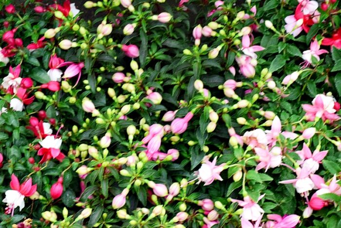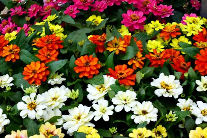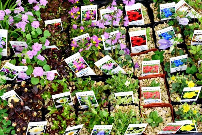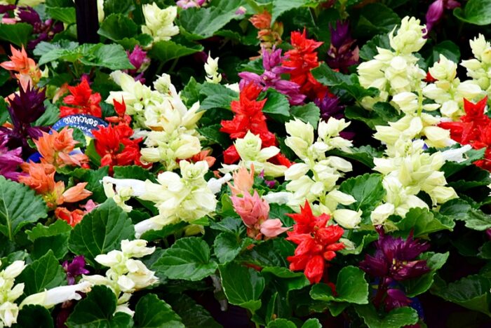 赤・白・ピンクなど色とりどりの小さな花がひとつのポットにぎゅっと詰まったサルビア ミックス植え
