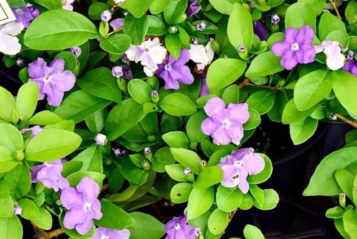 紫から白へと花色が変化し、甘く華やかな香りを放ちます。庭木としても鉢植えでも育てやすい常緑低木です。